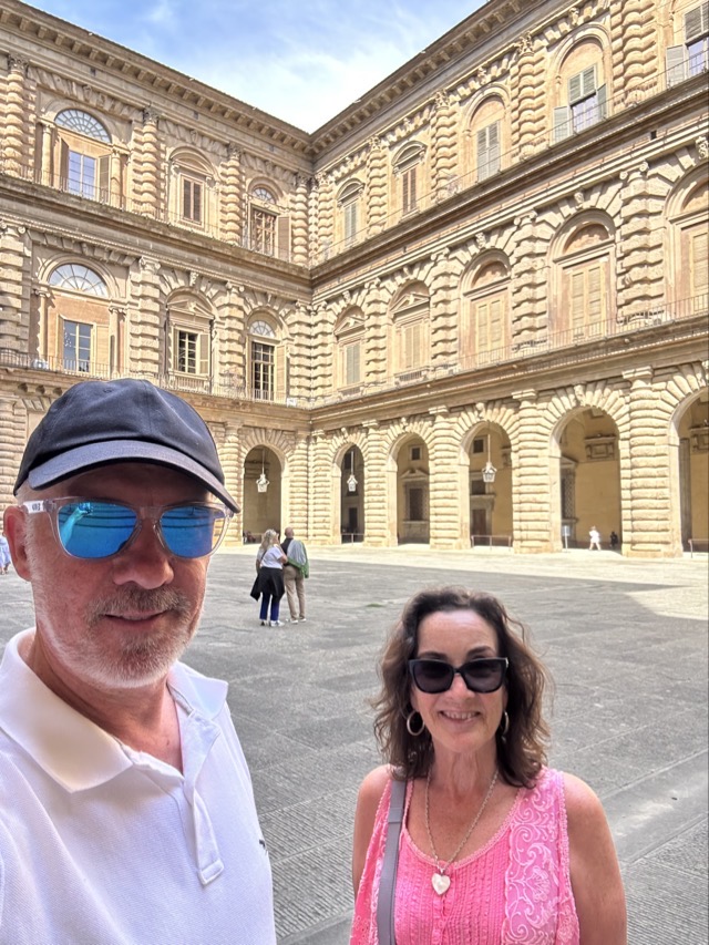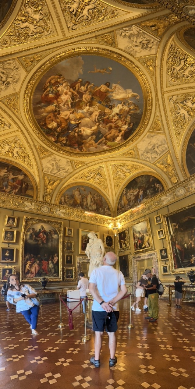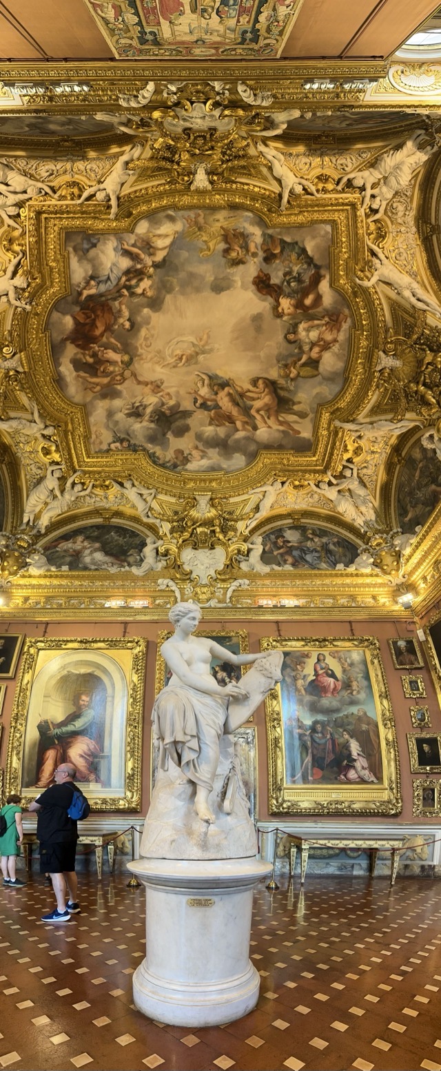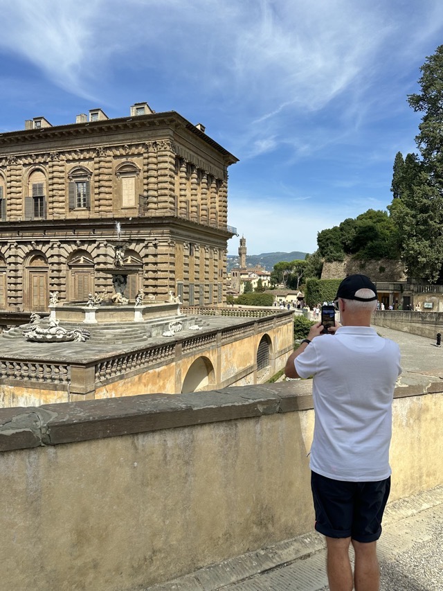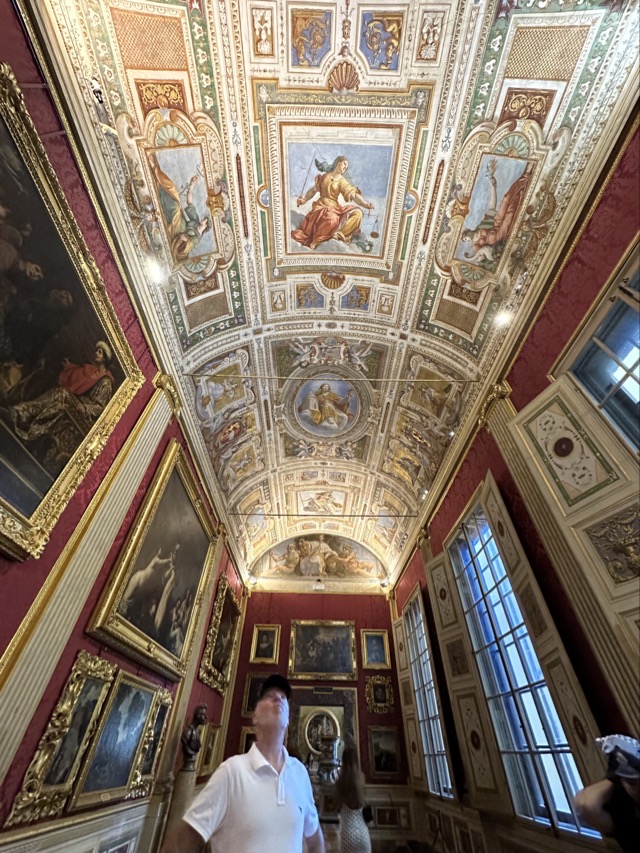 Mark and I spent the middle part of the day exploring the 15th Century Pitti Palace, the third main residence of the Medici family in Florence. We strolled through their former ‘apartments’ but this was a bit of a misleading expression. The rooms were empty of furniture and the walls were entirely covered with works of art; they weren’t set up as how the Medici’s had lived and used the space but it was still worthwhile visiting. We had heard on our walking tour that there was apparently one room set up in the Palace showing how Eleanor Medici had lived, and this room was connected to the elevated private walkway her husband, Cosimo Medici, had created for her that extended from this Palace all the way across the Arno and through to Palazzo Vecchio, but sadly this room wasn’t available for viewing today.