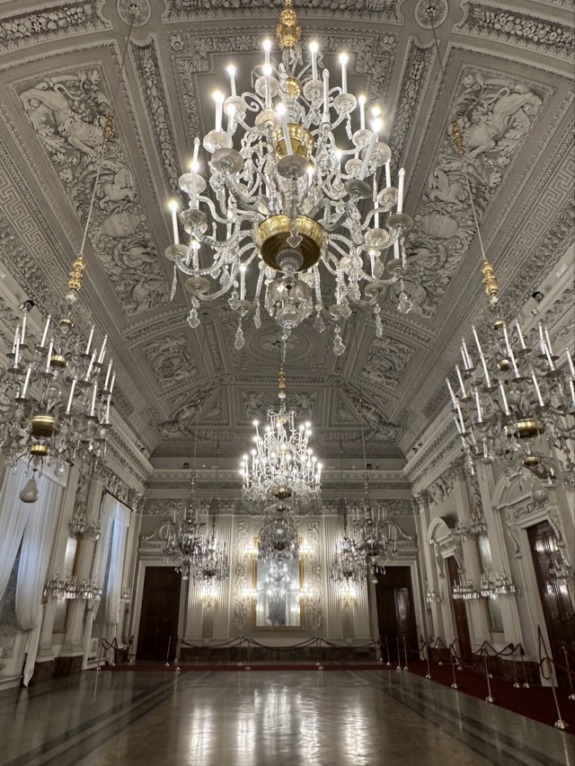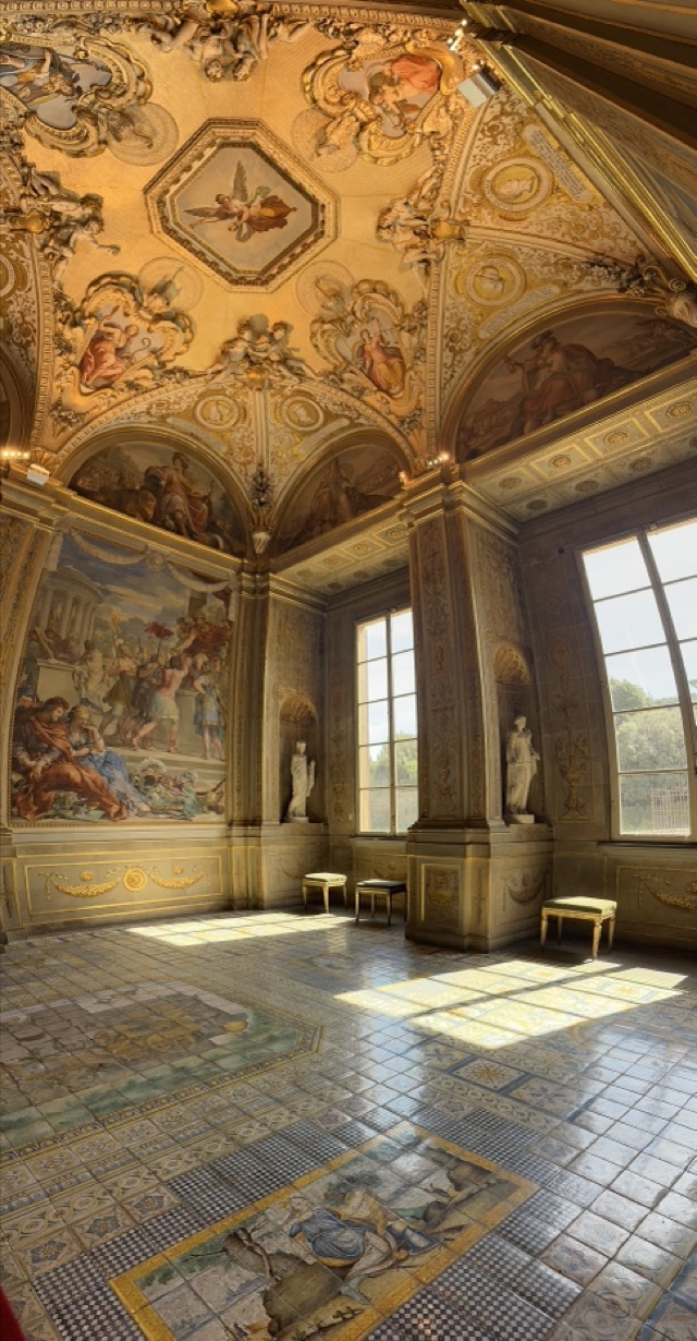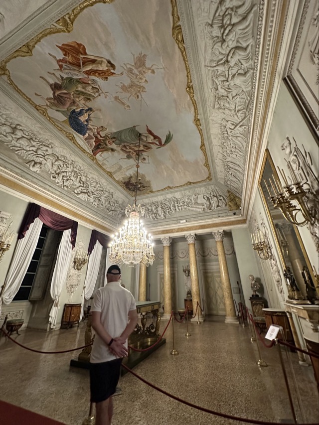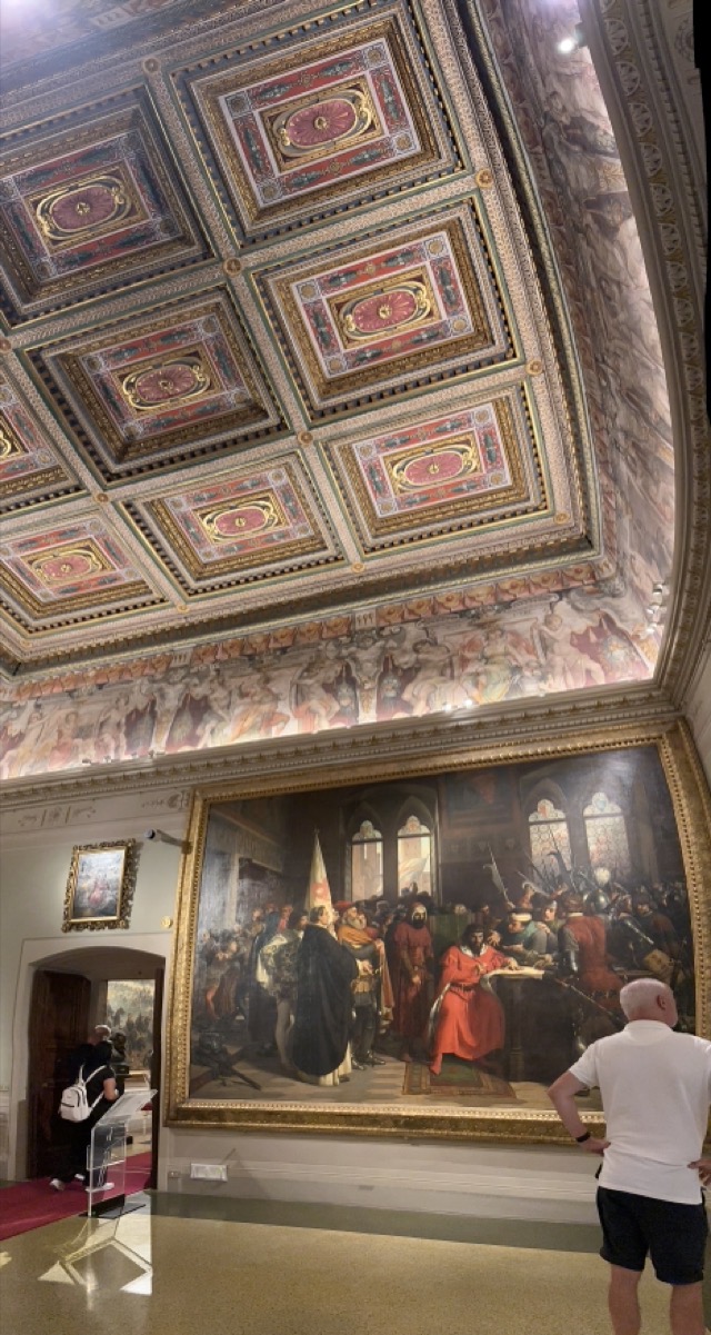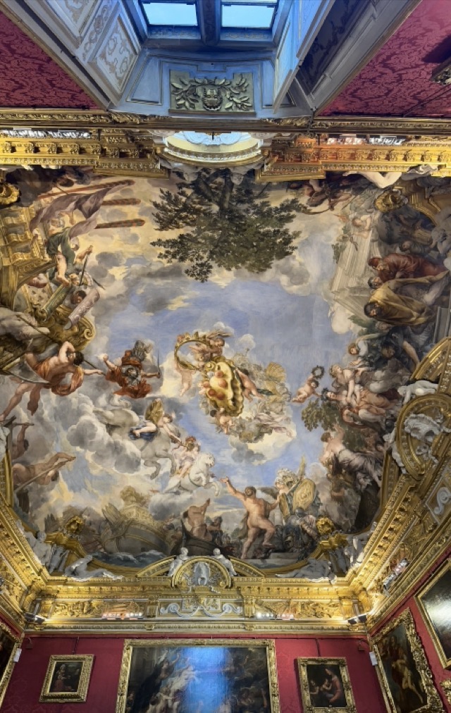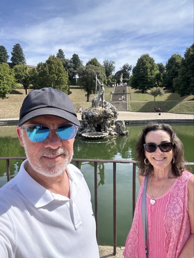 Mark and I spent the middle part of the day exploring the 15th Century Pitti Palace, the third main residence of the Medici family in Florence. We strolled through their former ‘apartments’ but this was a bit of a misleading expression. The rooms were empty of furniture and the walls were entirely covered with works of art; they weren’t set up as how the Medici’s had lived and used the space but it was still worthwhile visiting. We had heard on our walking tour that there was apparently one room set up in the Palace showing how Eleanor Medici had lived, and this room was connected to the elevated private walkway her husband, Cosimo Medici, had created for her that extended from this Palace all the way across the Arno and through to Palazzo Vecchio, but sadly this room wasn’t available for viewing today.