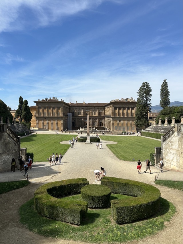 There was a history of fashion exhibition on the floor above the apartments and this was excellent and well worth the time to explore. We also walked through the modern art gallery but I was a bit overloaded by this stage and keen to sit down. I’d walked 10 km and 14,000 steps already and was quite tired so we went and sat in the cafeteria to rest for a bit. The third and final part of our Pitti Palace visit was the Boboli Garden. This was an extensive and quite magnificent garden but all I could feel as we wandered around was disappointment. Disappointment that this garden was not made into public space and available for all the inhabitants of Florence. There is very little green space available in the city and to have this huge garden, so close to the city, secluded as part of a museum seemed very cruel.