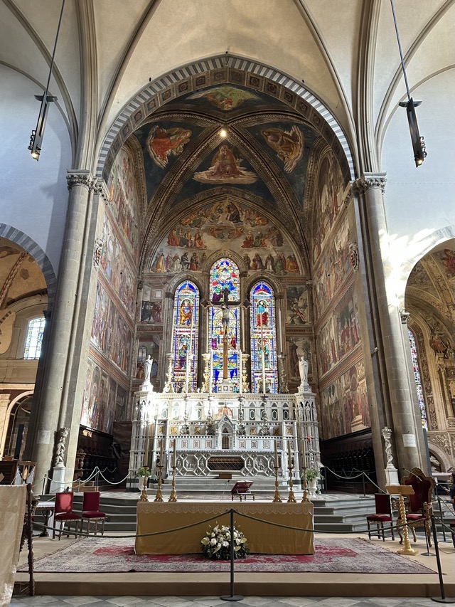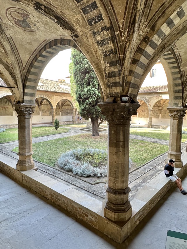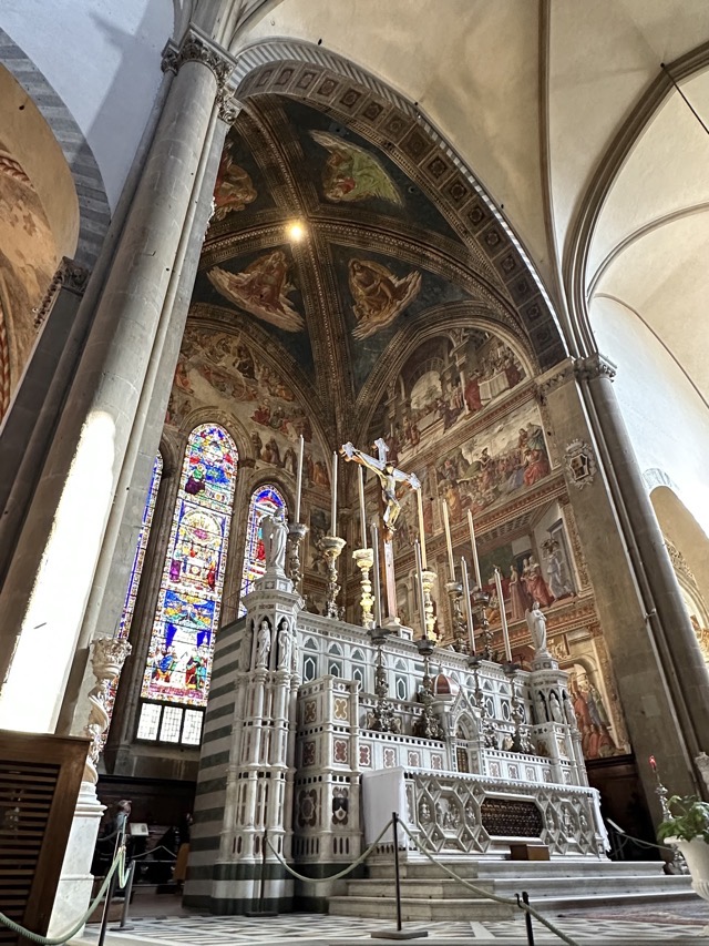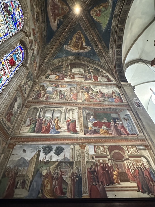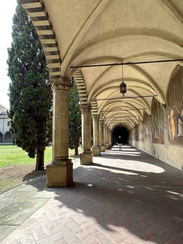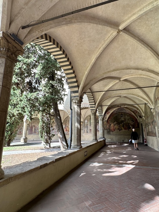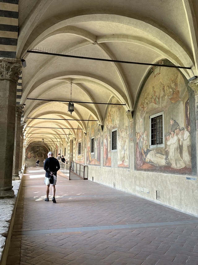 Santa Maria Novella is a huge basilica with extensive grounds and we learned, via the accompanying audio guide, that it was founded in the 14th century by the Dominican order to help counteract heresy. The Dominicans’ cruel treatment of heretics and behavior during the crusades is well documented so it was rather unsettling to walk the magnificent Basilica, admiring the beauty and majesty of the place, with all of that dark period running through the back of my mind. Trying to put that aside though, the sheer scale of magnificent frescoes inside the Basilica, in the many chapels and on all of the walls of the enormous cloister was just mind boggling. We had visited Varenna and admired the amazing frescoes in that city and those of this Basilica were right up there with them. Even if you are not spiritual / religious it is worth the visit just to take in the frescoes; they are just beautiful.