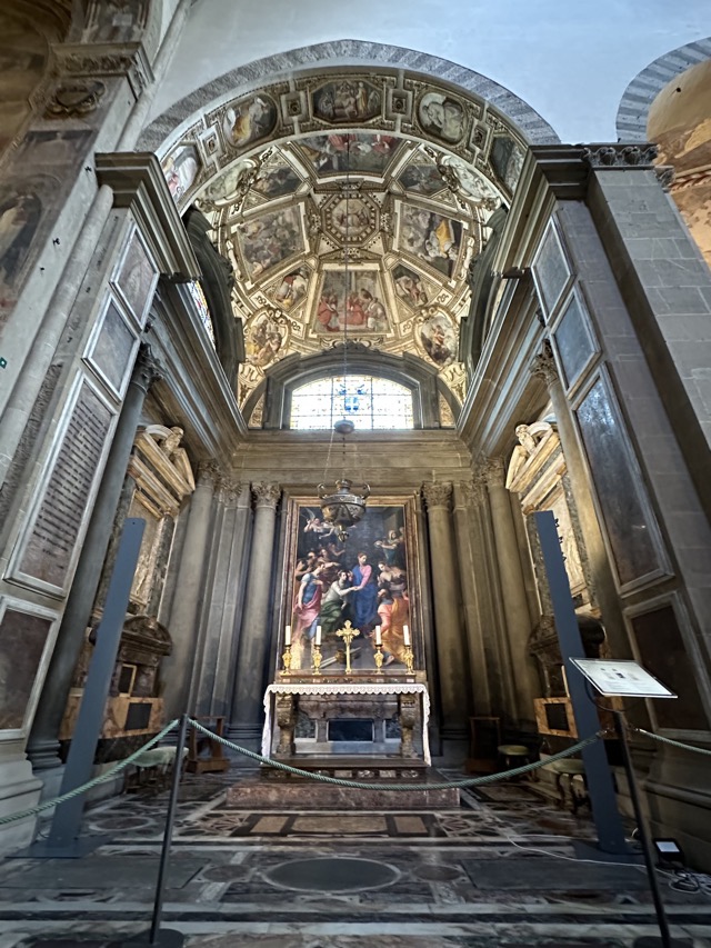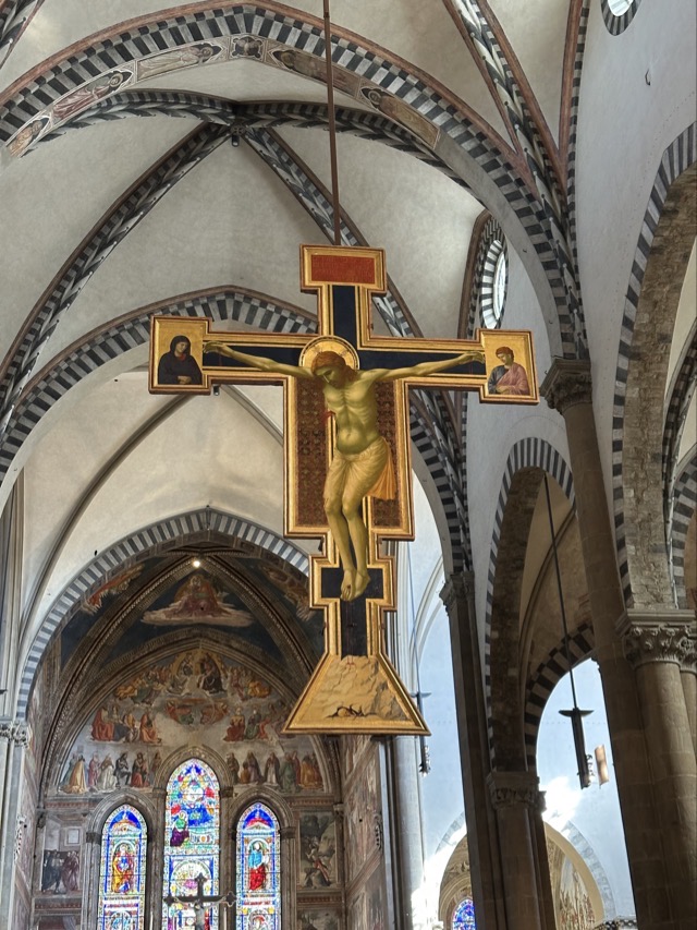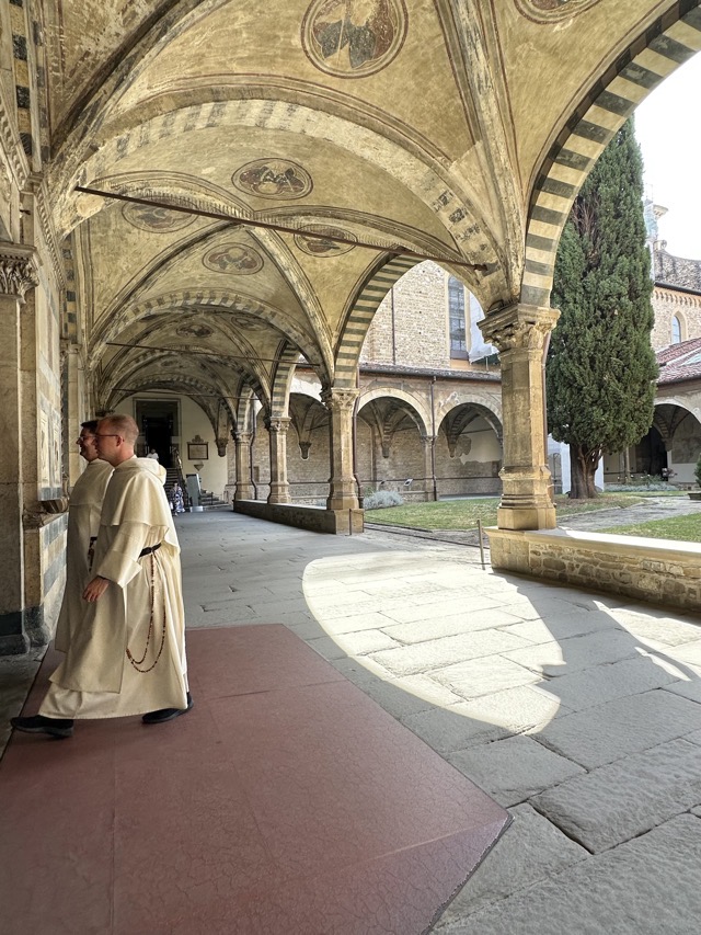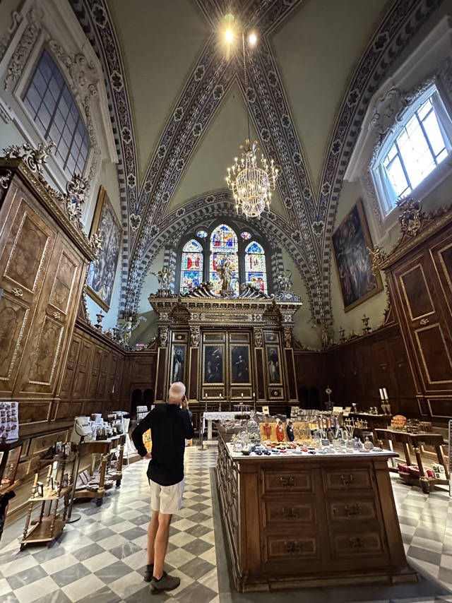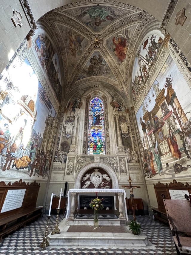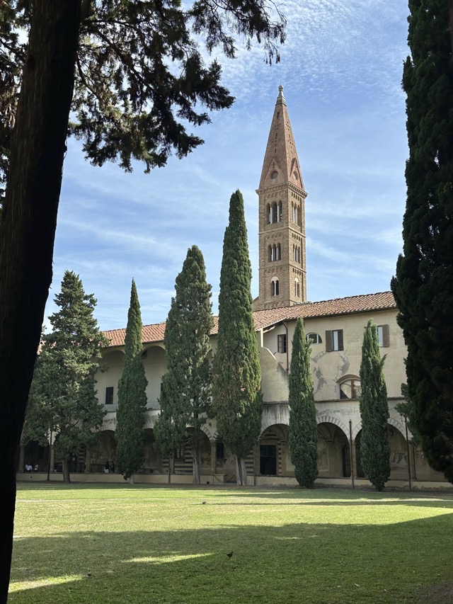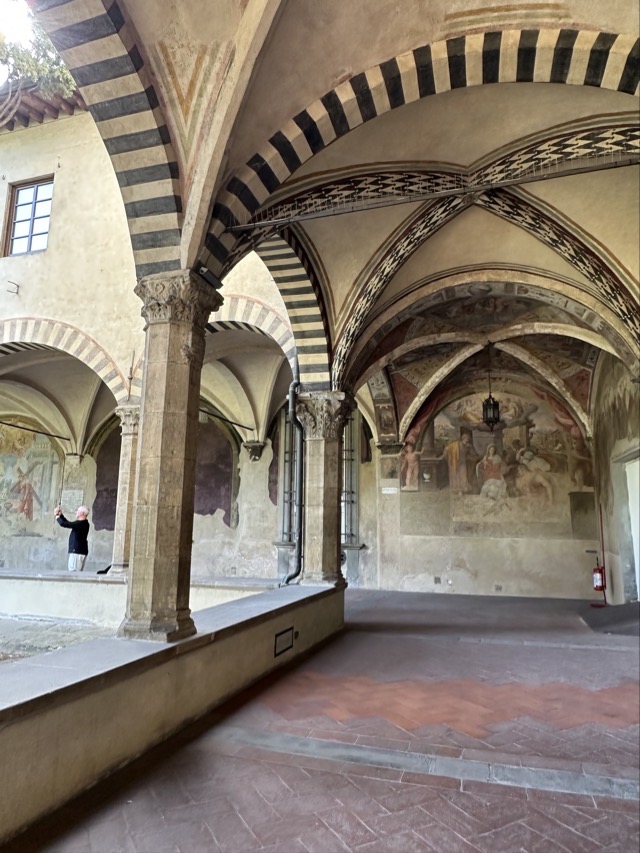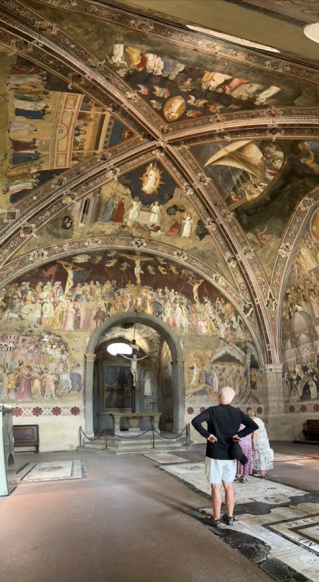 Santa Maria Novella is a huge basilica with extensive grounds and we learned, via the accompanying audio guide, that it was founded in the 14th century by the Dominican order to help counteract heresy. The Dominicans’ cruel treatment of heretics and behavior during the crusades is well documented so it was rather unsettling to walk the magnificent Basilica, admiring the beauty and majesty of the place, with all of that dark period running through the back of my mind. Trying to put that aside though, the sheer scale of magnificent frescoes inside the Basilica, in the many chapels and on all of the walls of the enormous cloister was just mind boggling. We had visited Varenna and admired the amazing frescoes in that city and those of this Basilica were right up there with them. Even if you are not spiritual / religious it is worth the visit just to take in the frescoes; they are just beautiful.