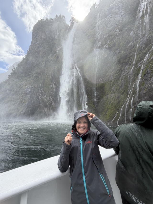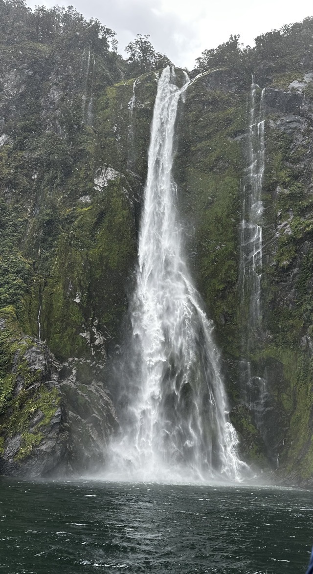 The drive from Te Anau up to Milford Sound was 120 km and took us a bit over two hours with a few photo stops along the way. We were then ushered on to the Milford Haven boat, cruising up and down the length of Milford Sound, to the Tasman Sea entry and back, and this journey took about two hours as it is only 13 km in length. Milford Sound is not the longest fiord in the area but it is one of the steepest and that is what provided the spectacular viewing throughout the cruise. There are only two permanent waterfalls along Milford Sound but, with all the rain they’d had, we were lucky to have an abundance of waterfalls to view on our cruise. Simon informed us that this region of Fiordland had been carved out by 8 glaciers over the years and the sheer and steep sides along Milford Sound were breathtakingly amazing and beautiful at the same time making this a worthwhile experience.